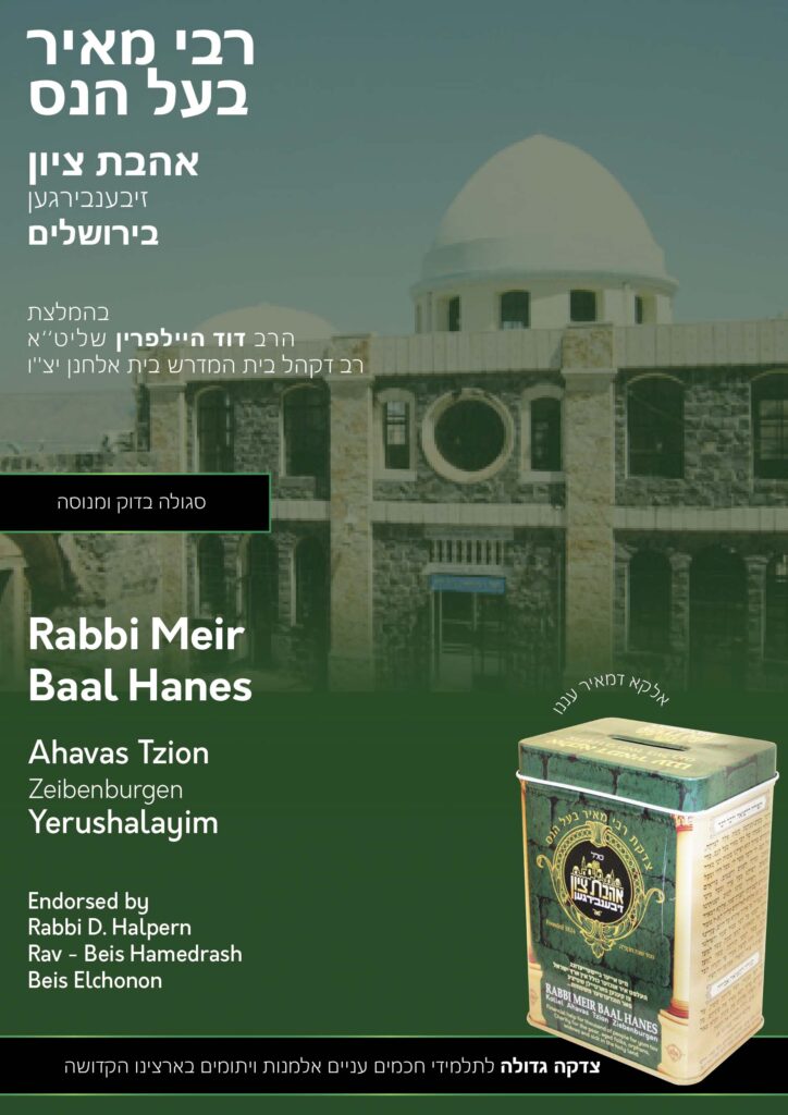 We ask you to extend your support to these noble institutions and become a partner in their holy work. In the zechus (merit) of your assistance and support of Kollel Rabbi Meir Baal Hanes, may you be blessed with Shefa Brocho (abundance of blessings) and Hatzlocho (success) in all your endeavors.